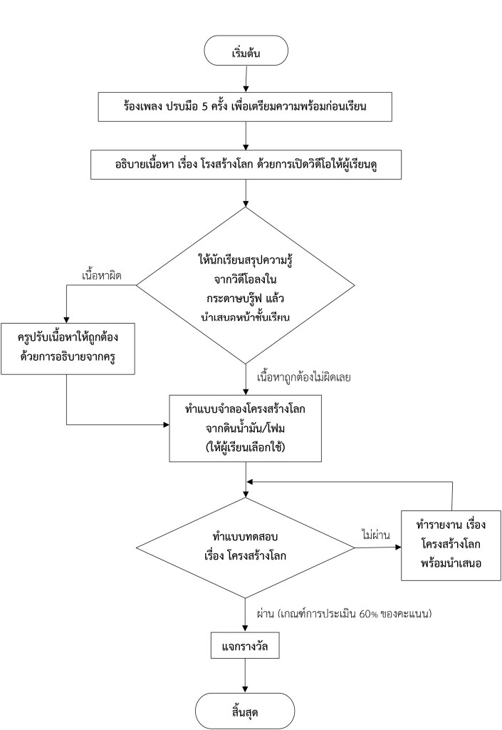 เริ่มต้นครูผู้สอน เตรียมพร้อมนักเรียนก่อนการเข้าสู่บทเรียนด้วยการร้องเพลงปรบมือ 5 ครั้งจากนั้นอธิบายเนื้อหาเกี่ยวกับโครงสร้างโลกโดยการเปิดวีดีโอเรื่องโครงสร้างโลกให้กับนักเรียน ได้ดูภายในห้องเรียนเมื่อดูวีดีโอ เสร็จแล้วครูได้ให้นักเรียนสรุปความรู้จากวีดีโอที่ได้ดูลงในกระดาษบรู๊ฟ แล้วนำมาเสนอหน้าห้องเรียนหากเนื้อหาที่นักเรียนได้ทำการสรุปลงในกระดาษบรู๊ฟผิดครูจะปรับเนื้อหาให้ถูกต้องด้วยการอธิบายจากครูเองให้นักเรียนได้เข้าใจถึงเนื้อหาที่แท้จริง แต่หากว่าเนื้อหาที่นักเรียนสรุปความรู้แล้วพร้อมกับนำมาเสนอจากถูกแล้ว ครูจะให้นักเรียนทำแบบจำลองโครงสร้างโลกโดยสร้างจากดินน้ำมันหรือโฟมซึ่งครูจะให้ผู้เรียนเลือกใช้เอง แล้วแต่ความสะดวกแต่กำหนดขอบเขตไว้ว่าจะต้องใช้ดินน้ำมันหรือโฟมเท่านั้นจากนั้นเมื่อนักเรียนทำแบบจำลองโครงสร้างโลกเสร็จครูจะให้นักเรียนทำแบบทดสอบเรื่องโครงสร้างโลก หากนักเรียนทำไม่ผ่านนักเรียนจะต้องทำรายงานเรื่องโครงสร้างโลกพร้อมกับนำเสนอแล้วกลับไปทำแบบทดสอบเรื่องโครงสร้างโลกอีกครั้งจนกว่าจะผ่านแต่หากนักเรียนสามารถทำผ่านแล้วนักเรียนจะได้รับรางวัลตอบแทนสิ้นสุดเป็นอันว่าคู่มือการสอน